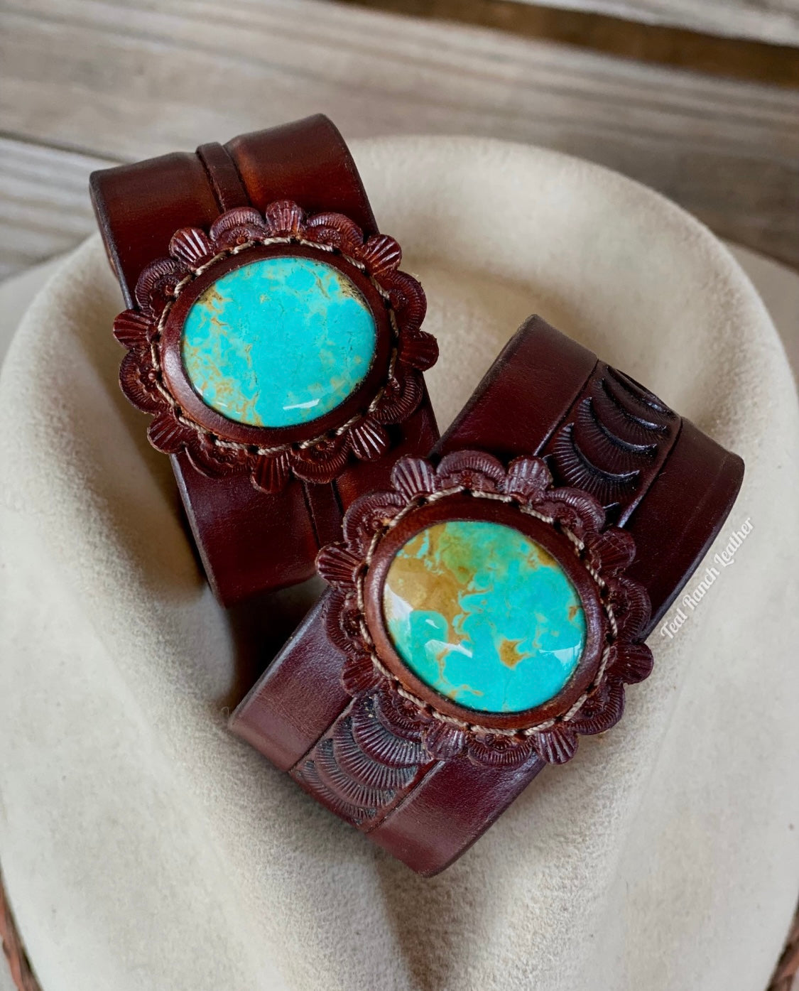 Each cuff has a hand picked piece of turquoise and is inlaid...