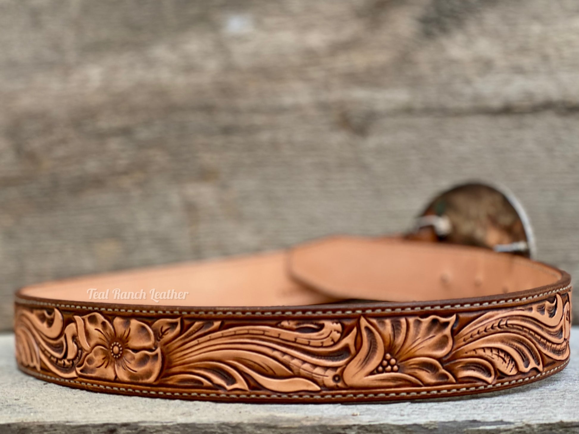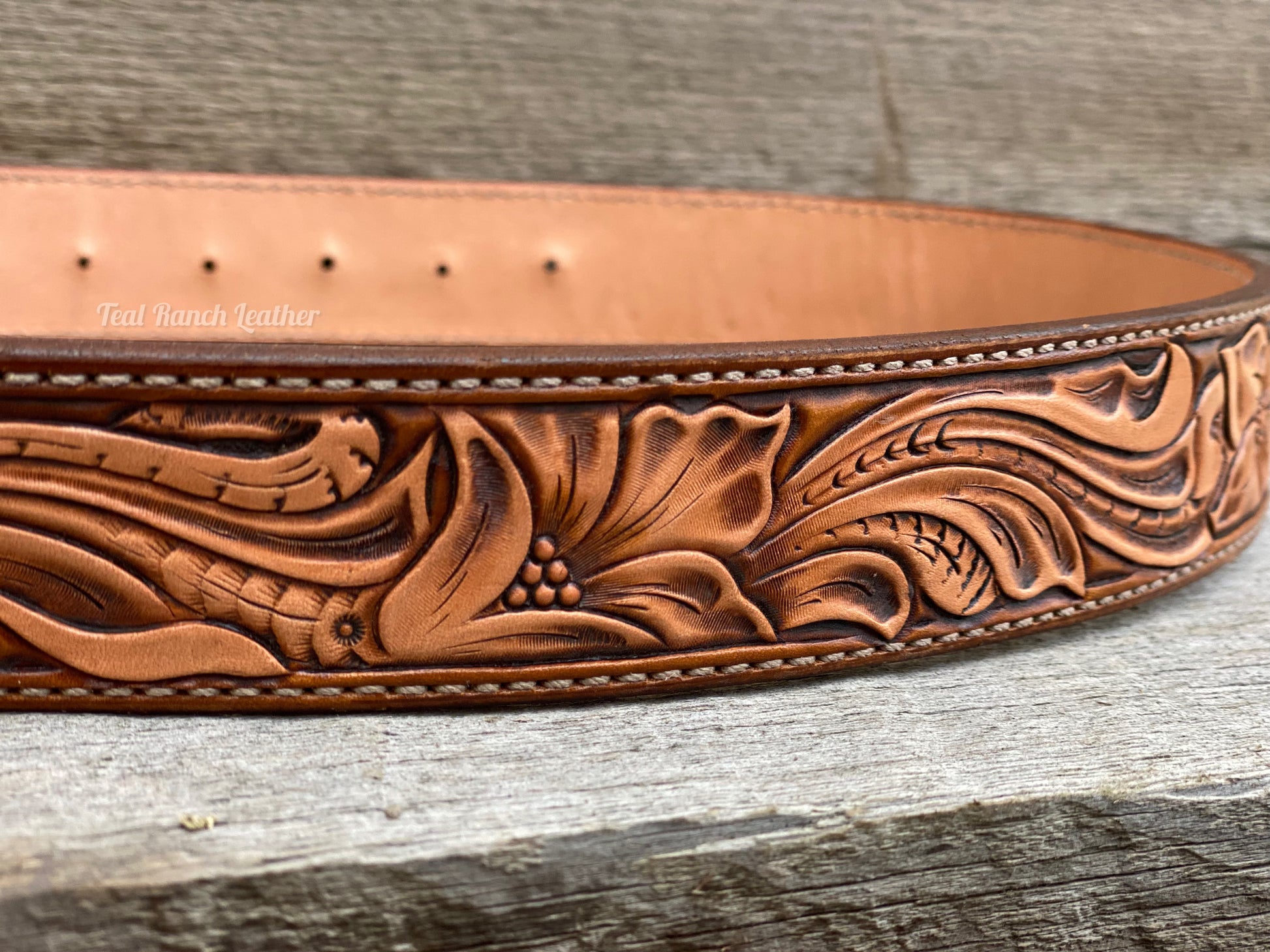 I use high quality Hermann oak leather and hand tool the floral scrolling.