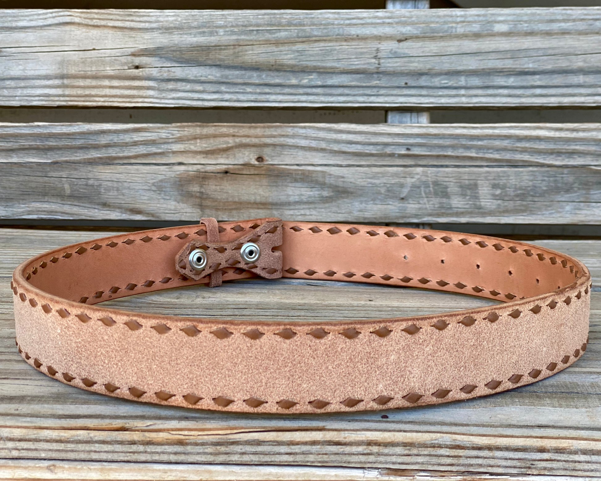 Leather rough out belt with brown buck stitch 27"