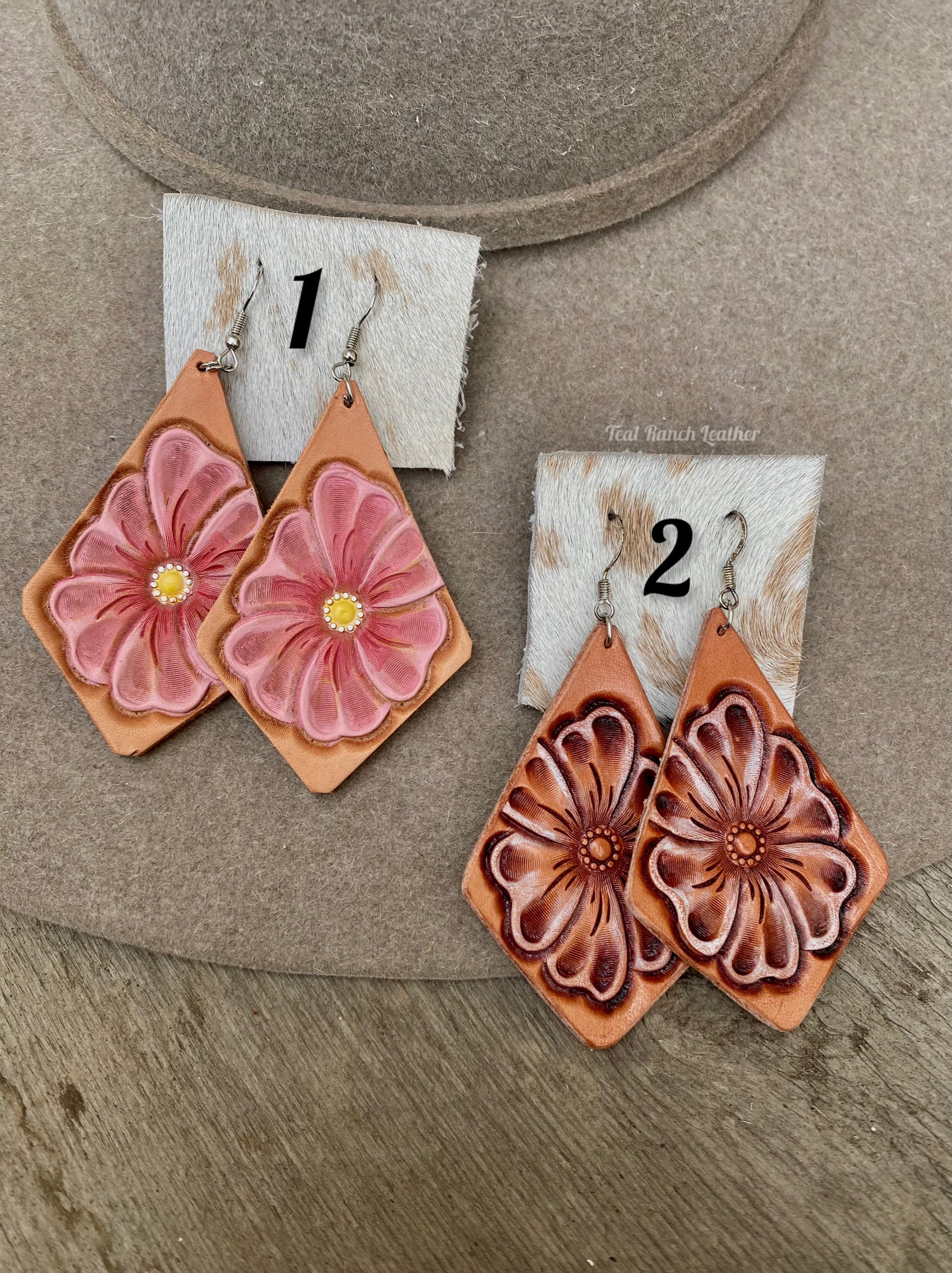 Tooled flower earrings made out of Hermann oak leather. I hand tool and hand dye each earring. These earring are really light weight and and have a fishhook closure on them.