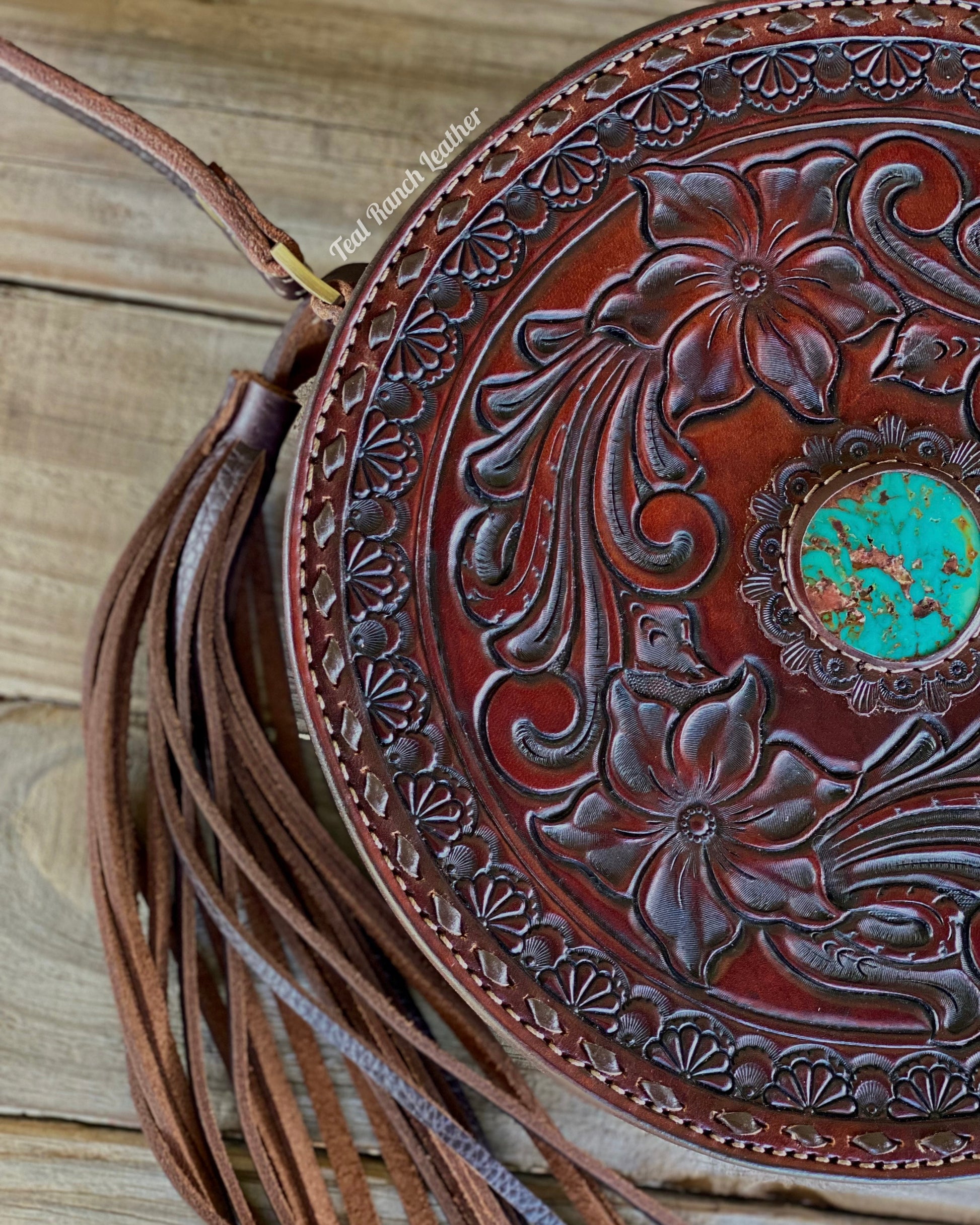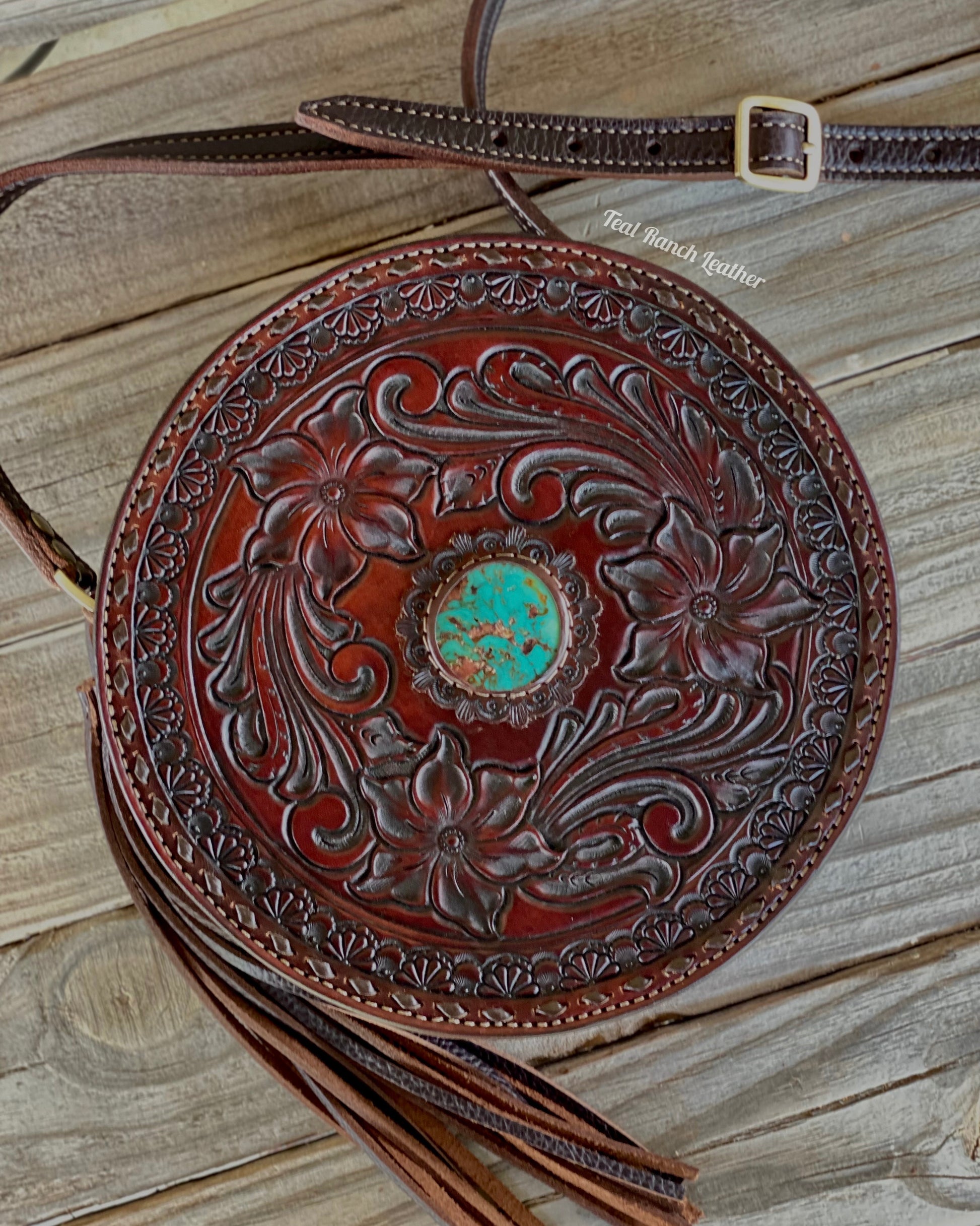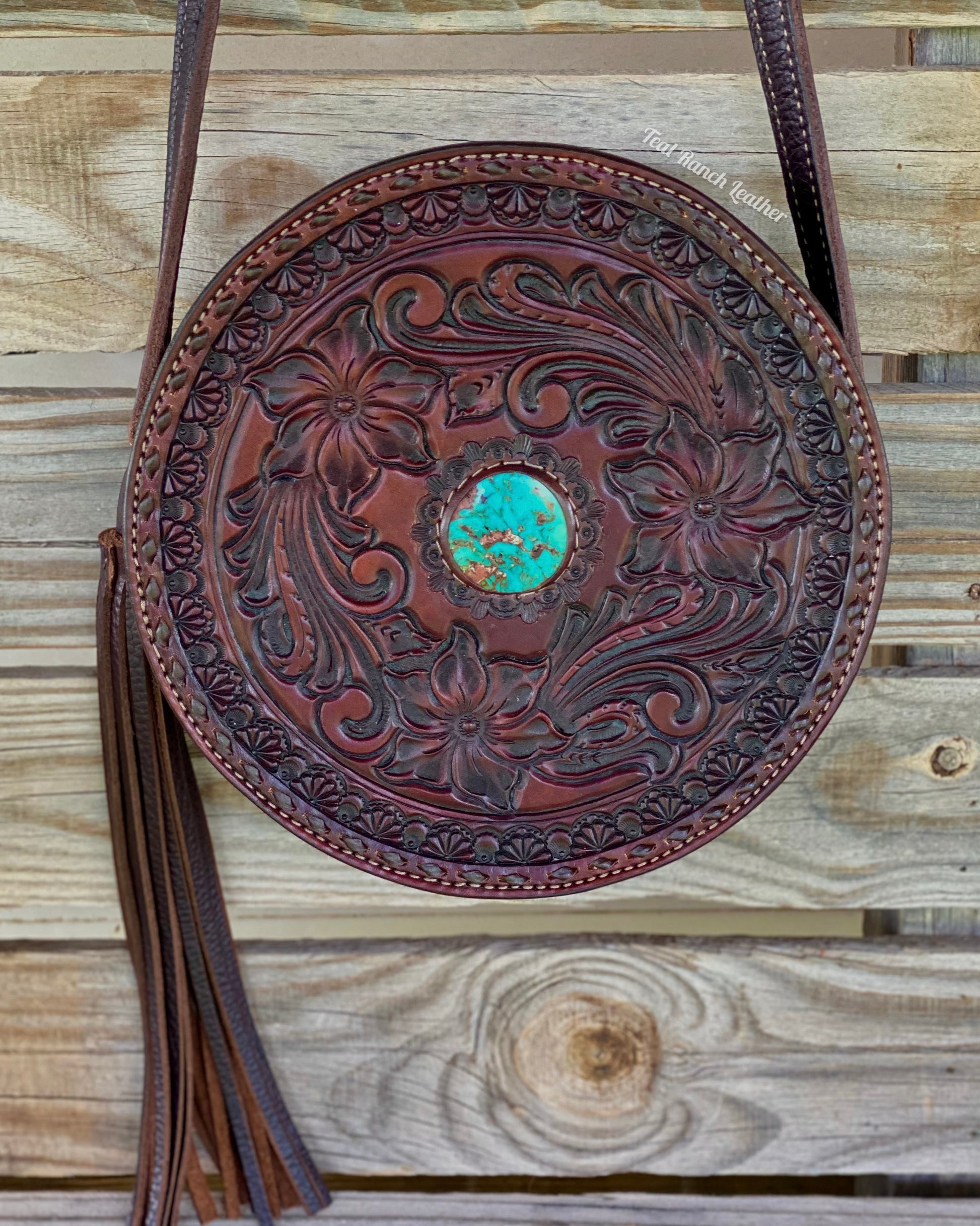 All my purses are hand tooled by myself using high quality hermann oak leather. This one has a beautiful large piece of Kingman turquoise. This purse has a simple leather lined interior and a pocket on the back of the purse to put your cellphone. This is a one of a kind purse!
