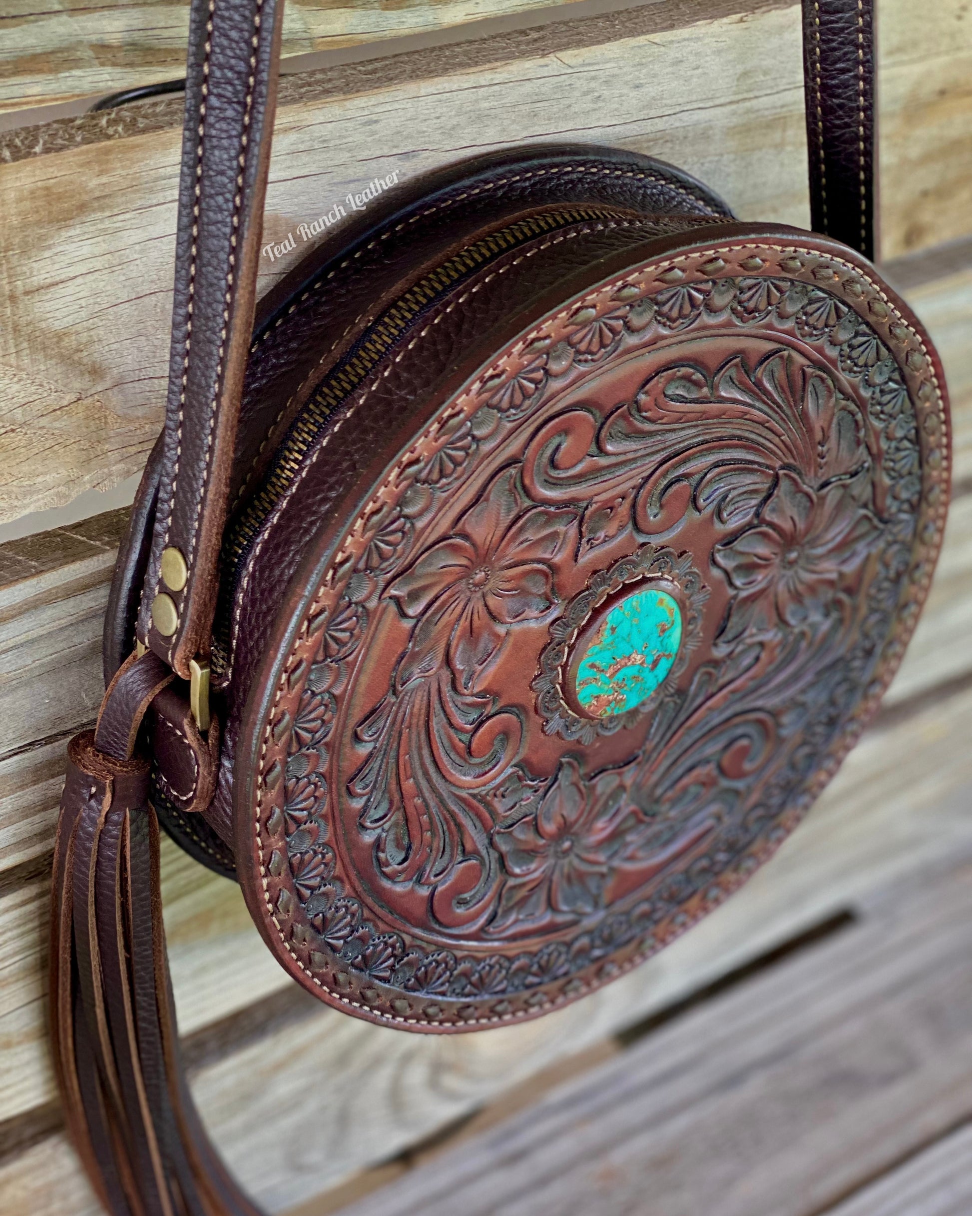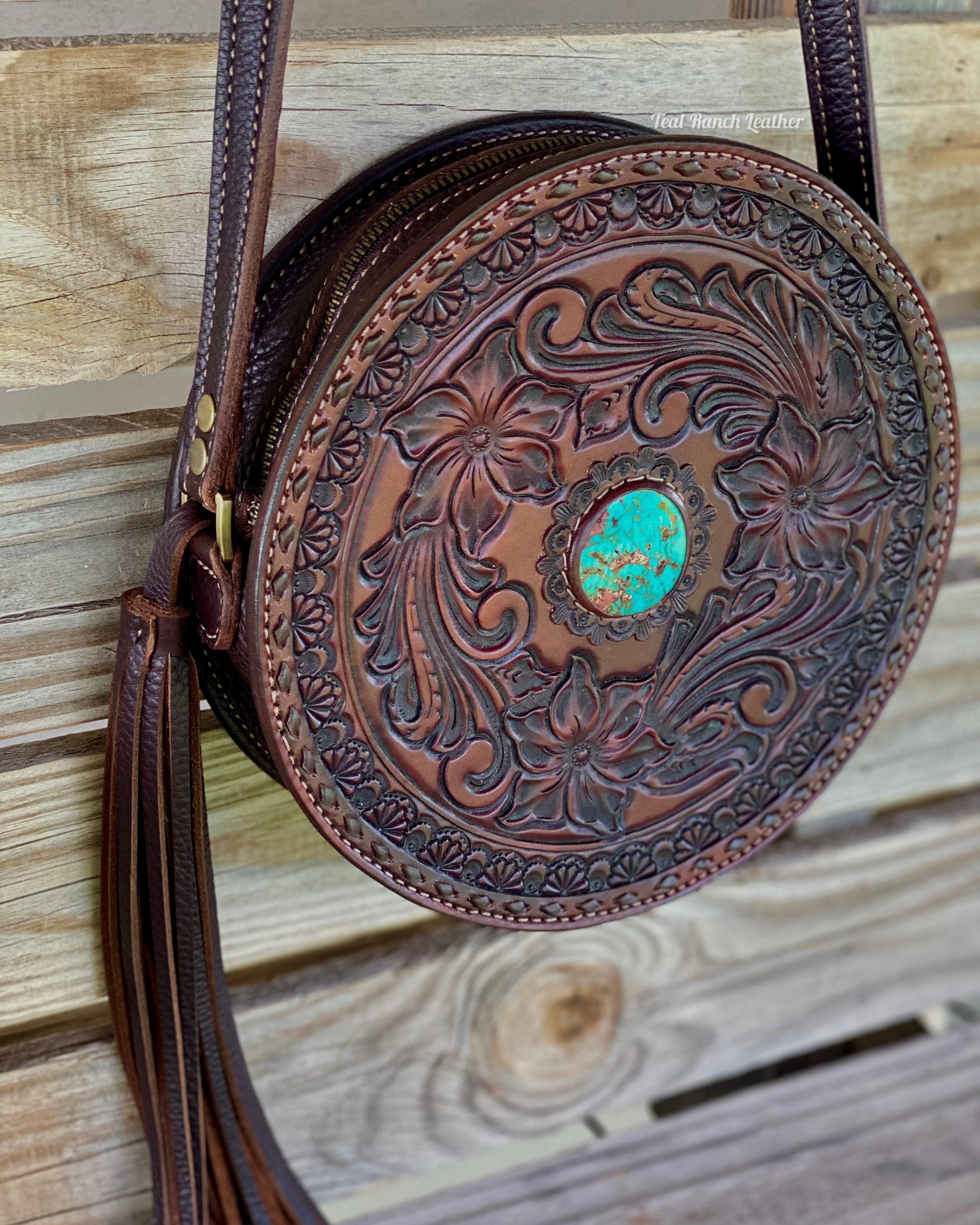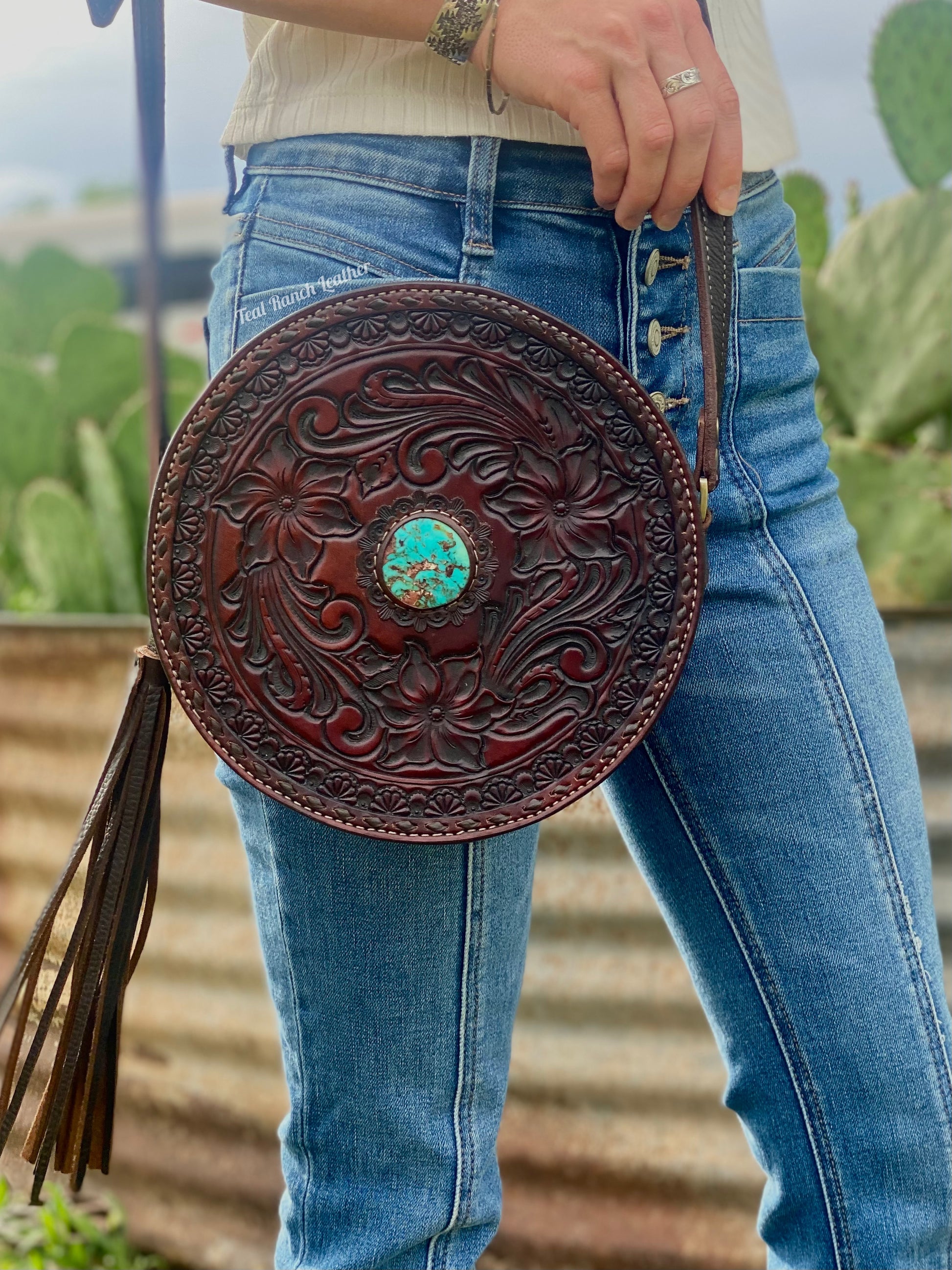 All my purses are hand tooled by myself using high quality hermann oak leather. This one has a beautiful large piece of Kingman turquoise. This purse has a simple leather lined interior and a pocket on the back of the purse to put your cellphone. This is a one of a kind purse!